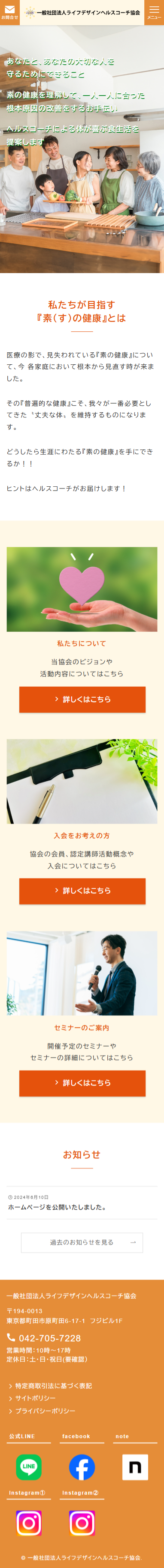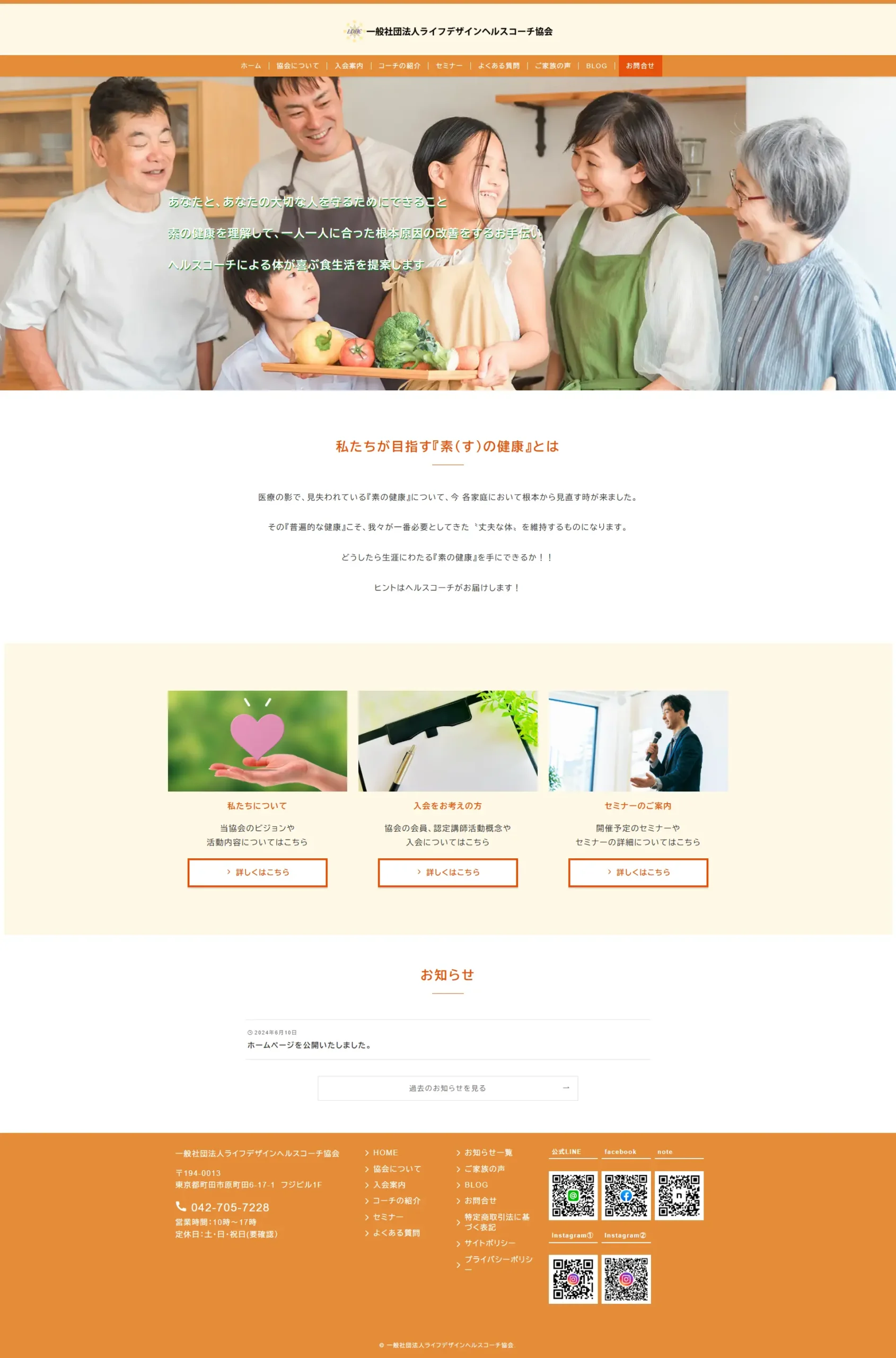 一般社団法人ライフデザインヘルスコーチ協会様 2024 8/15 制作実績 オレンジ系 2024年8月15日2024年12月13日 PCで見た時の画面↓ スマートフォンで見た時の画面↓ 下記ボタンから実際のホームページをご覧いただけます。 実際のホームページはこちら 制作実績 オレンジ系 よかったらシェアしてね! URLをコピーしました! URLをコピーしました! MOTHER SEA様(よもぎ蒸し・骨盤ケアサロン) NEXT STAGE様(引越し) 関連記事 DEL MAR(デルマール)様(レンタルスペース) DEL MAR(デルマール)様(デリバリー・ケータリング) 株式会社ビッグヤード様(デリバリー・ケータリング) 住まいのお色直し 美建様(外壁塗装・屋根塗装) エングロービスプロ株式会社様(ビジネスサポート) ULOS様(飲食店の総合コンサルティング) 株式会社SCAFFOLDING様(総合とび工事) 合同会社ZENKU様(抗菌&カビ取り業者)
